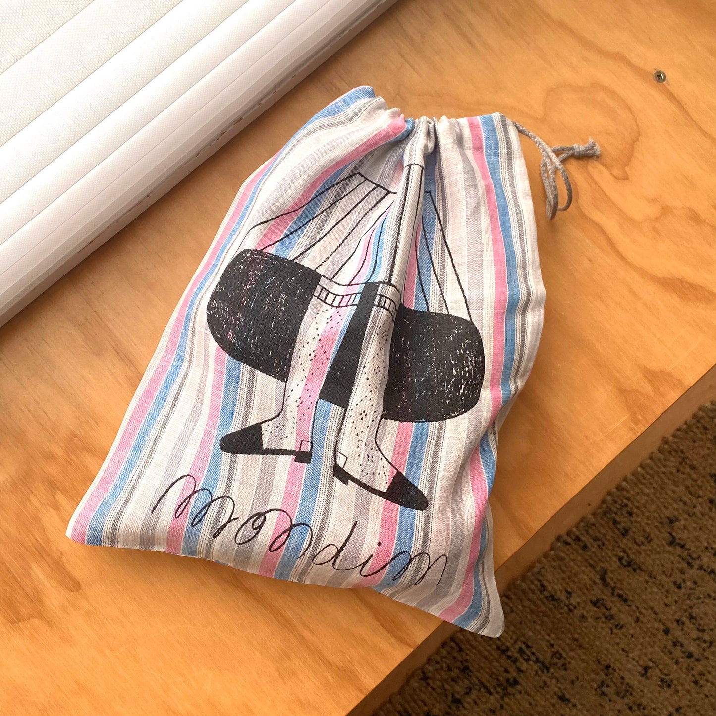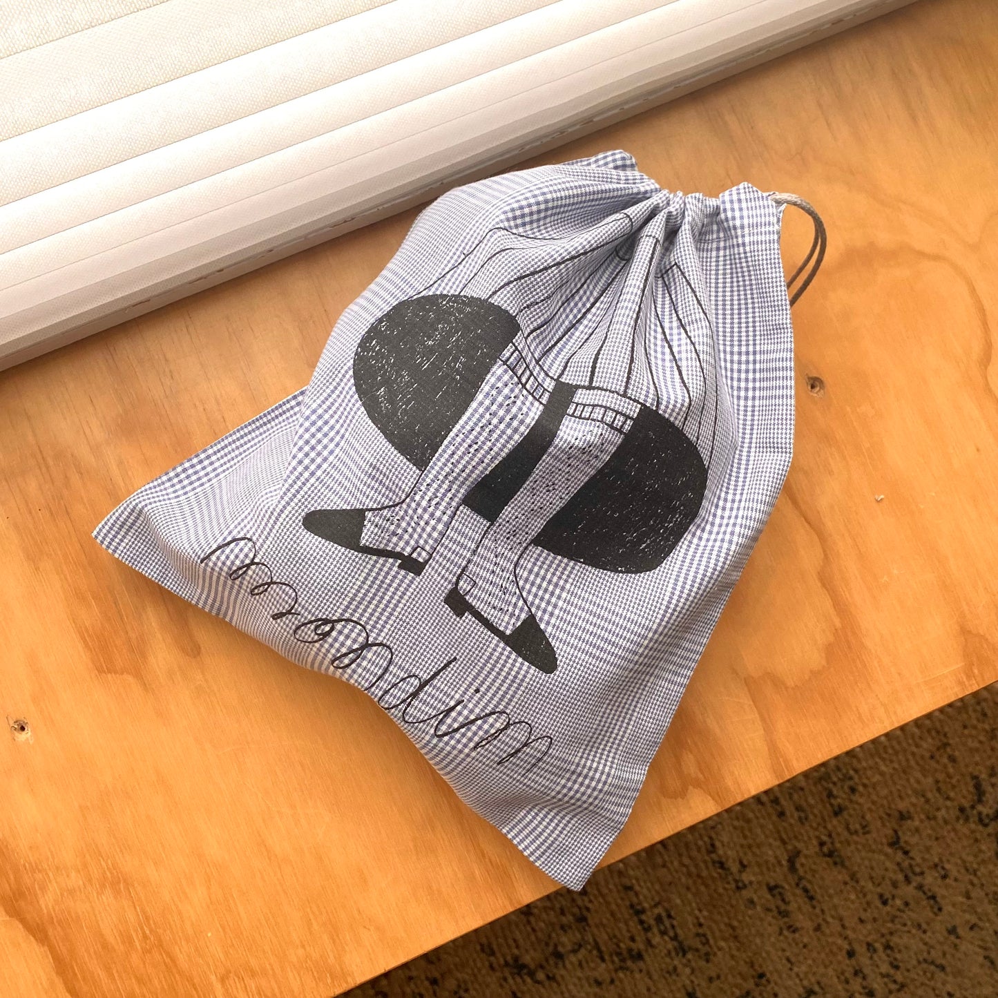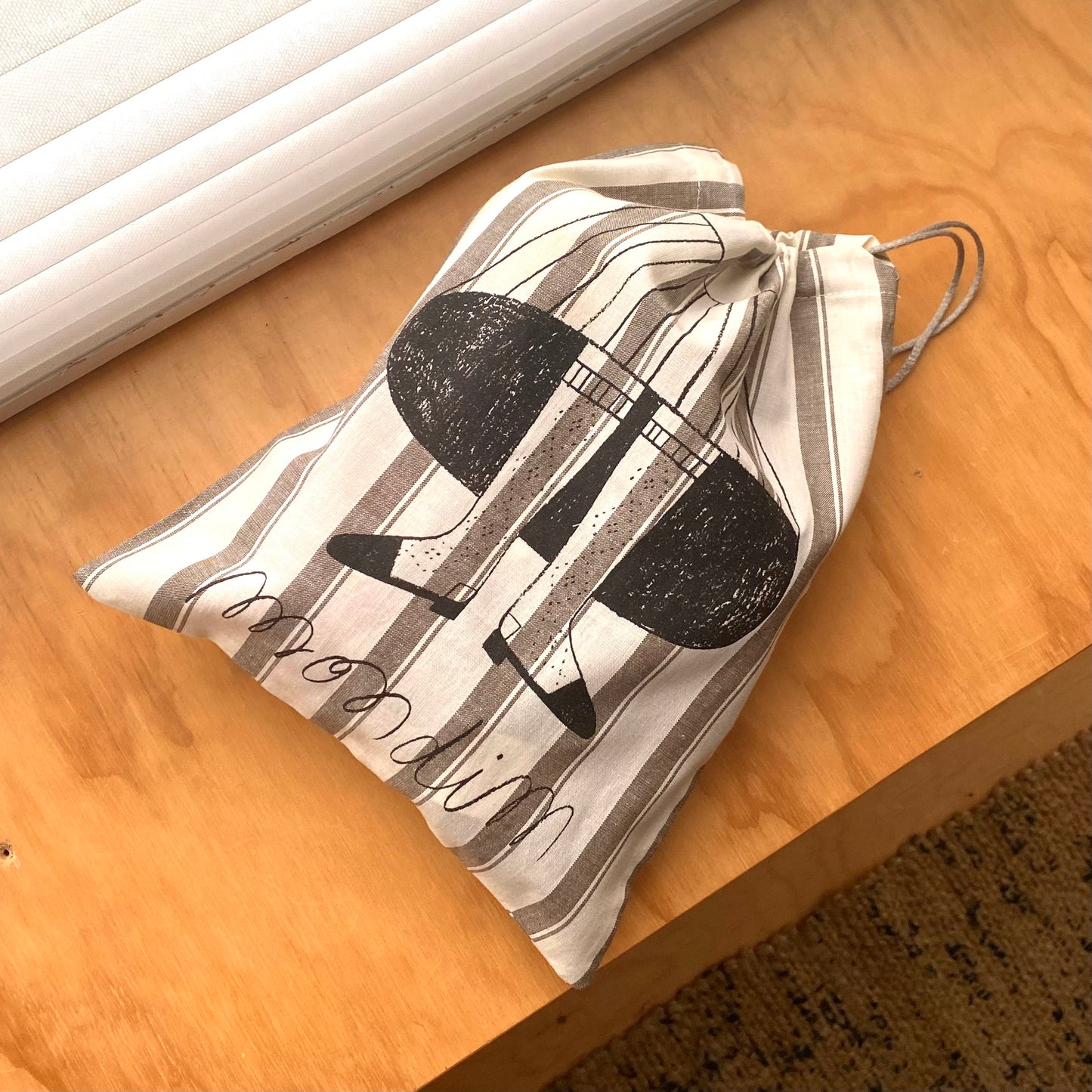 These cotton-linen drawstring project bags feature the original illustration by Joana Estrela for Retrosaria's yarnMondim. Perfect for carrying your projects in to keep them safe and secure!