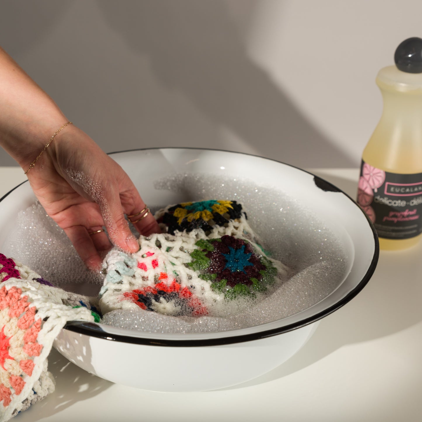 A classic for a reason - Eucalan soap is a delicate lanolin-enriched wool soap that's perfect for washing and blocking your projects. Best of all, you don't even need to rinse this soap out. Simply add a cap-full to a bowl of warm water, soak your project in it for 10-15 mins, squeeze out the excess water, and lay flat to dry. No rinsing needed!