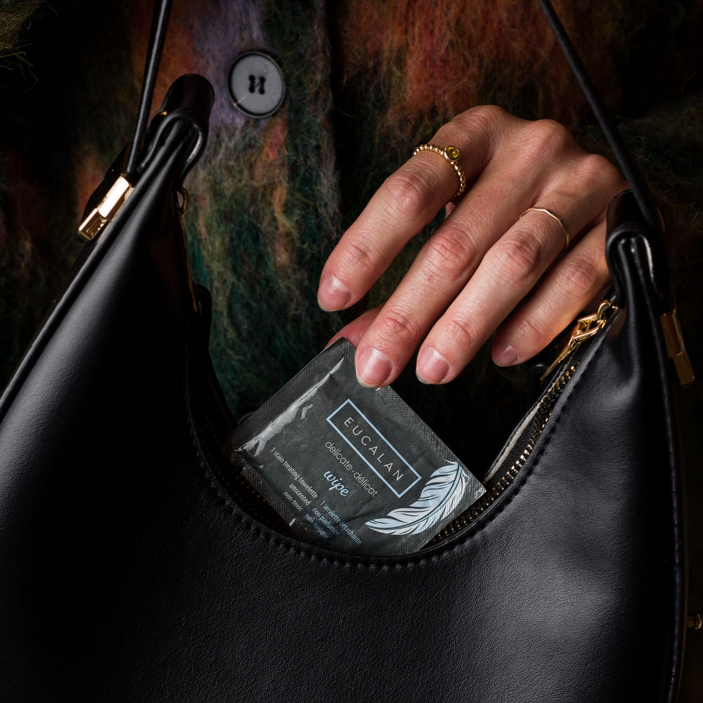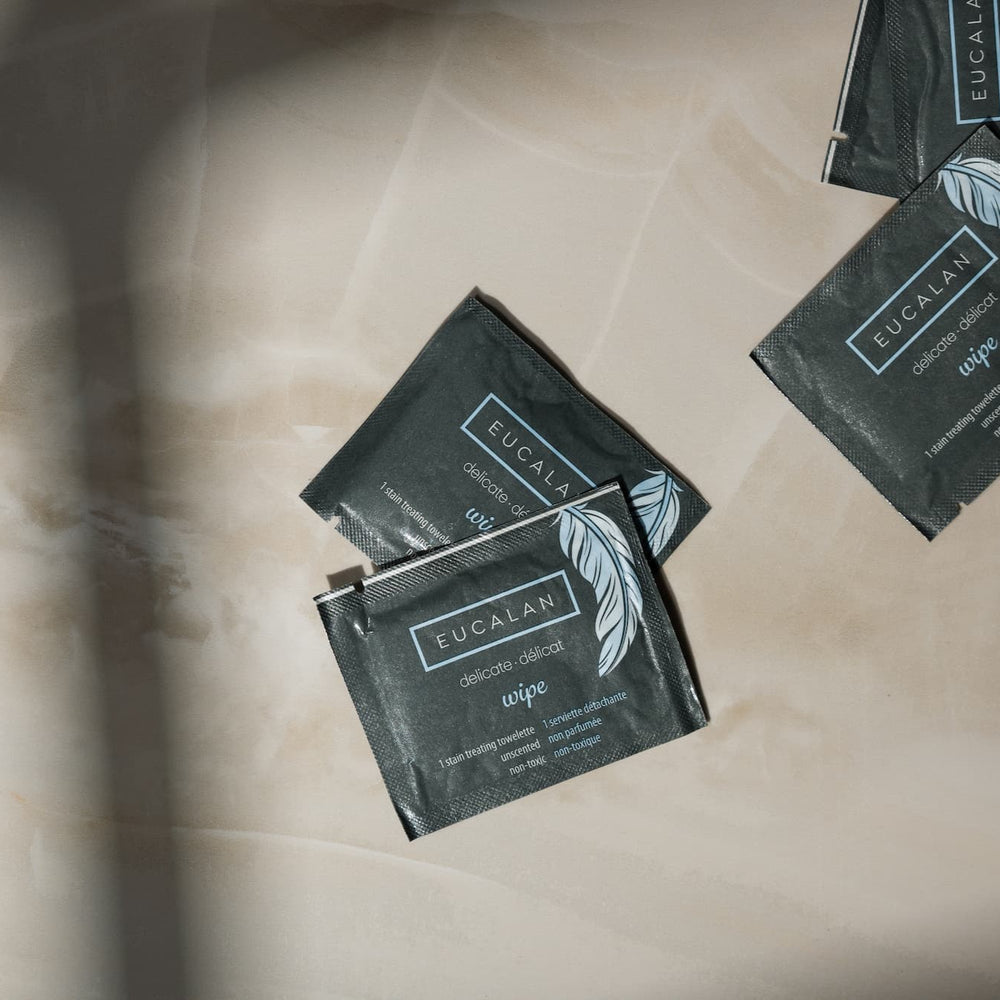 Eucalan's saturated towelettes are individually packaged for your on-the-go stain emergencies. Simply blot or rub the wipe on the affected spot as soon as possible for stain treating and garment freshening.