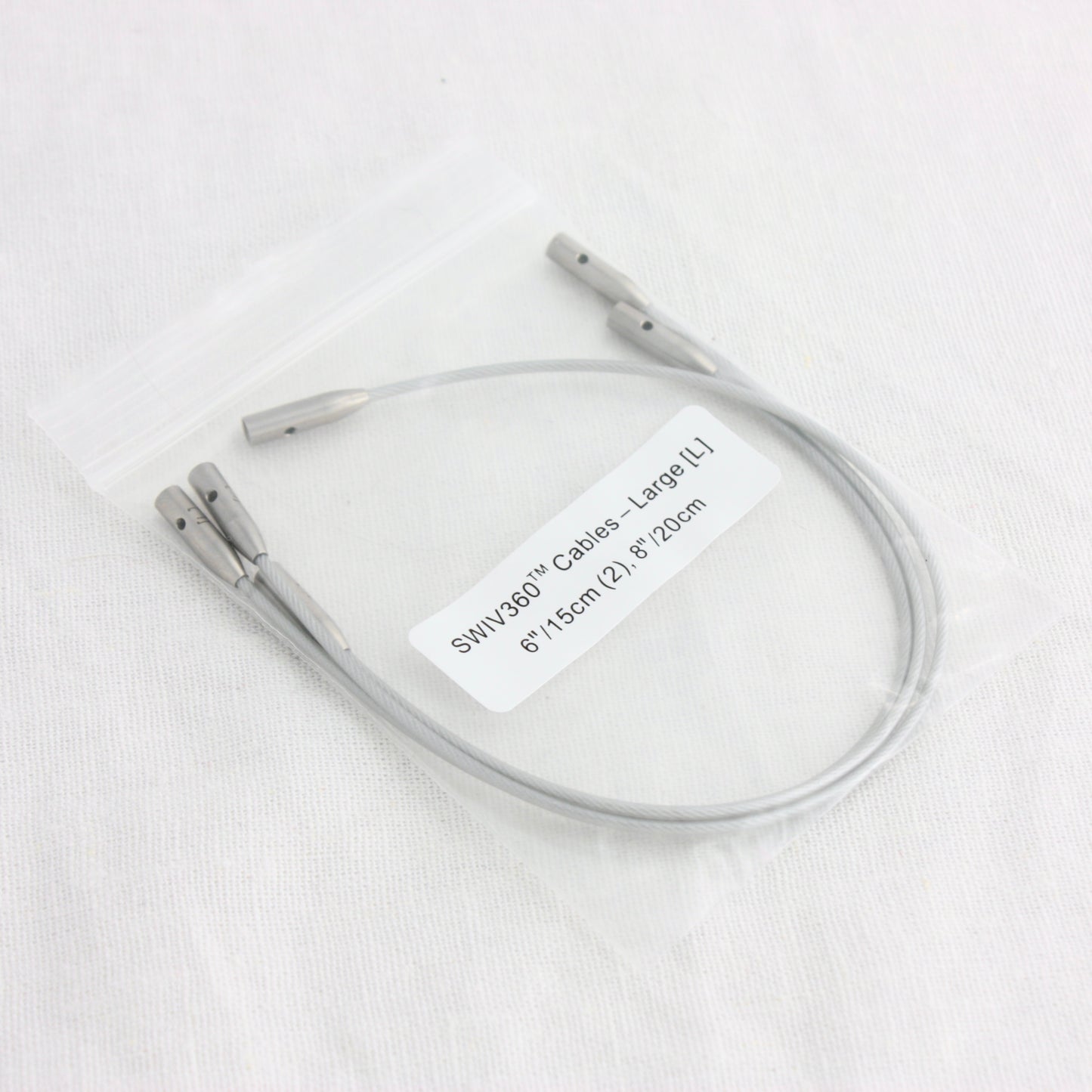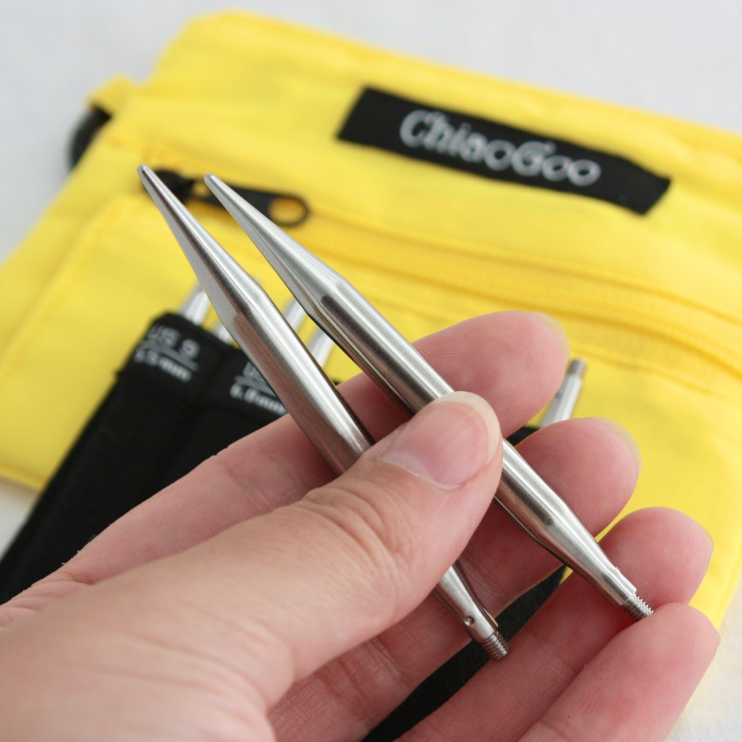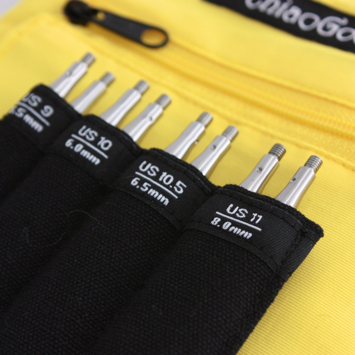 The Yellow Shorties Set comes with 4 stainless steel needle tips from 5.5-8mm, in the 3" tip length. It also comes with one 8" and two 6" swivel cables for making small-circumference circulars. Everything including stoppers, keys, connectors, stitch markers, and a mini needle gauge comes packed in a cute yellow bag with a pocket on the front.