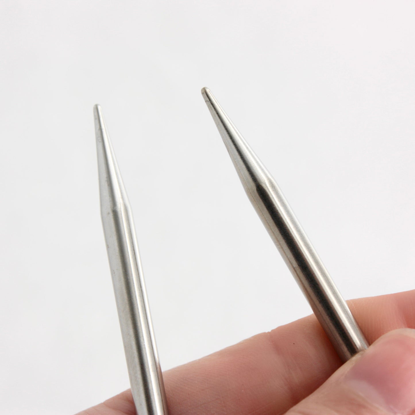 Metal needles like these are great for knitters who like a sharper needle tip, and they can also allow for faster knitting, since there's less friction between the yarn and the needles. For this reason, metal needles are often not well suited for beginner knitters.
